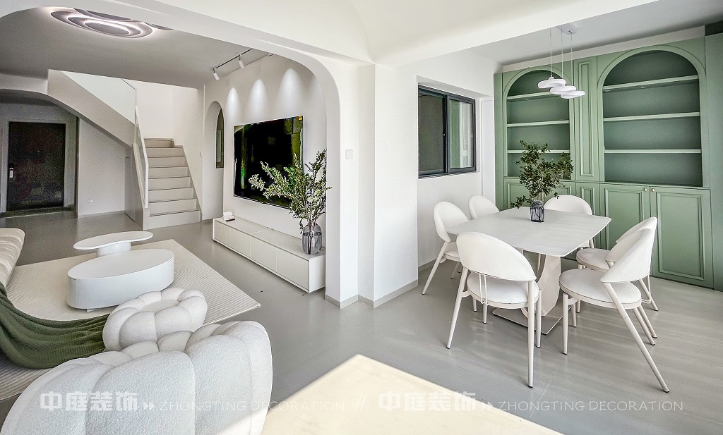 瀏覽量:94這一套綠意盎然的奶油風格好似把森林搬進了家,軟乎乎的奶白沙發(fā)搭配苔蘚綠毛毯,抱枕選了粉綠撞色,往上面一躺,一天的疲憊都被融化了!圓潤的白色組合茶幾,顏值與實用并存,氛圍感直接拉滿。墻面掛畫大葉綠植藝術畫,角落擺放鮮活綠植,將自然綠意融入空間。